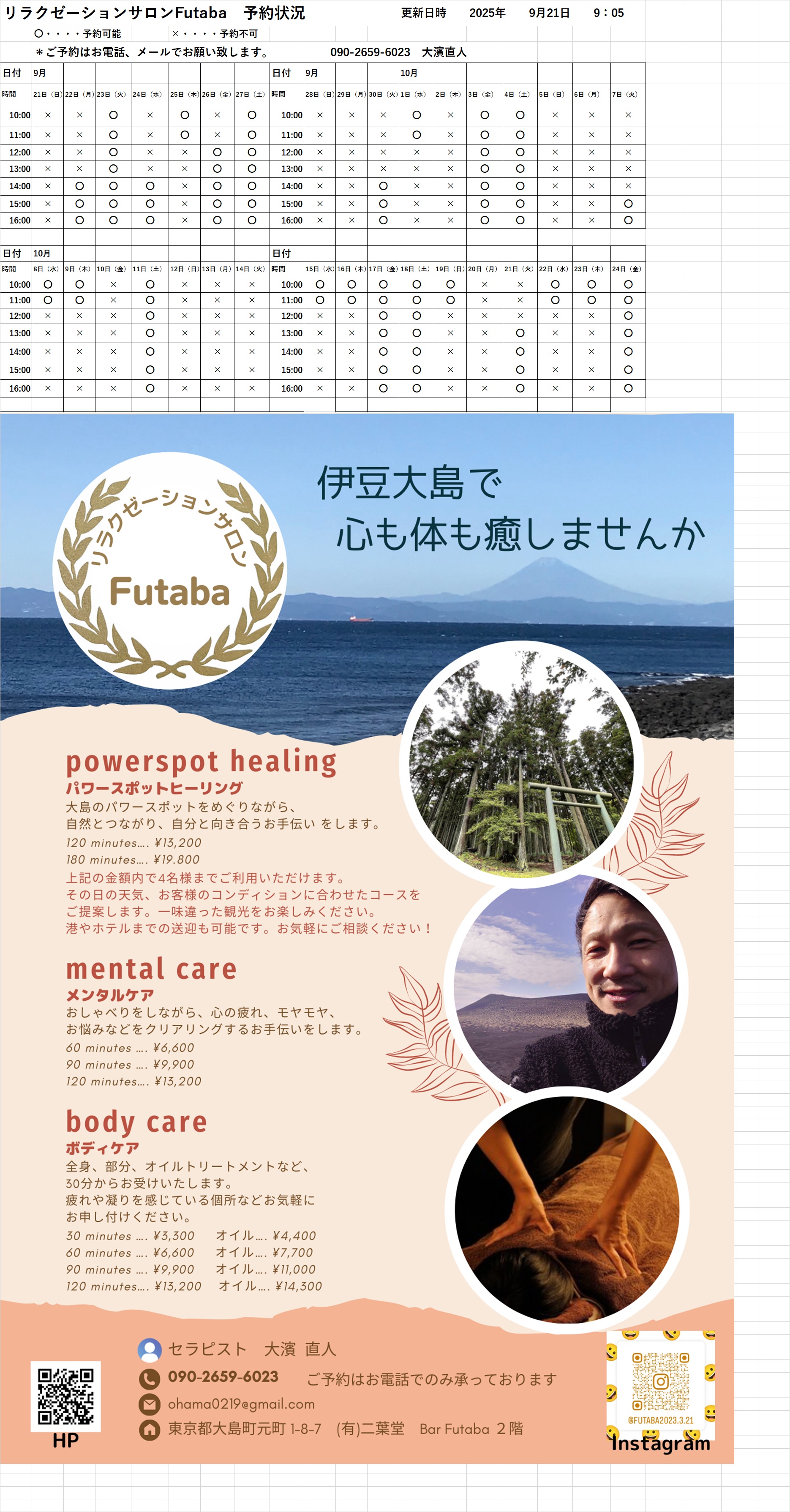 *ご予約状況確認表・・・現在のご予約状況です。空いてる時間をお電話、メールでご予約ください。